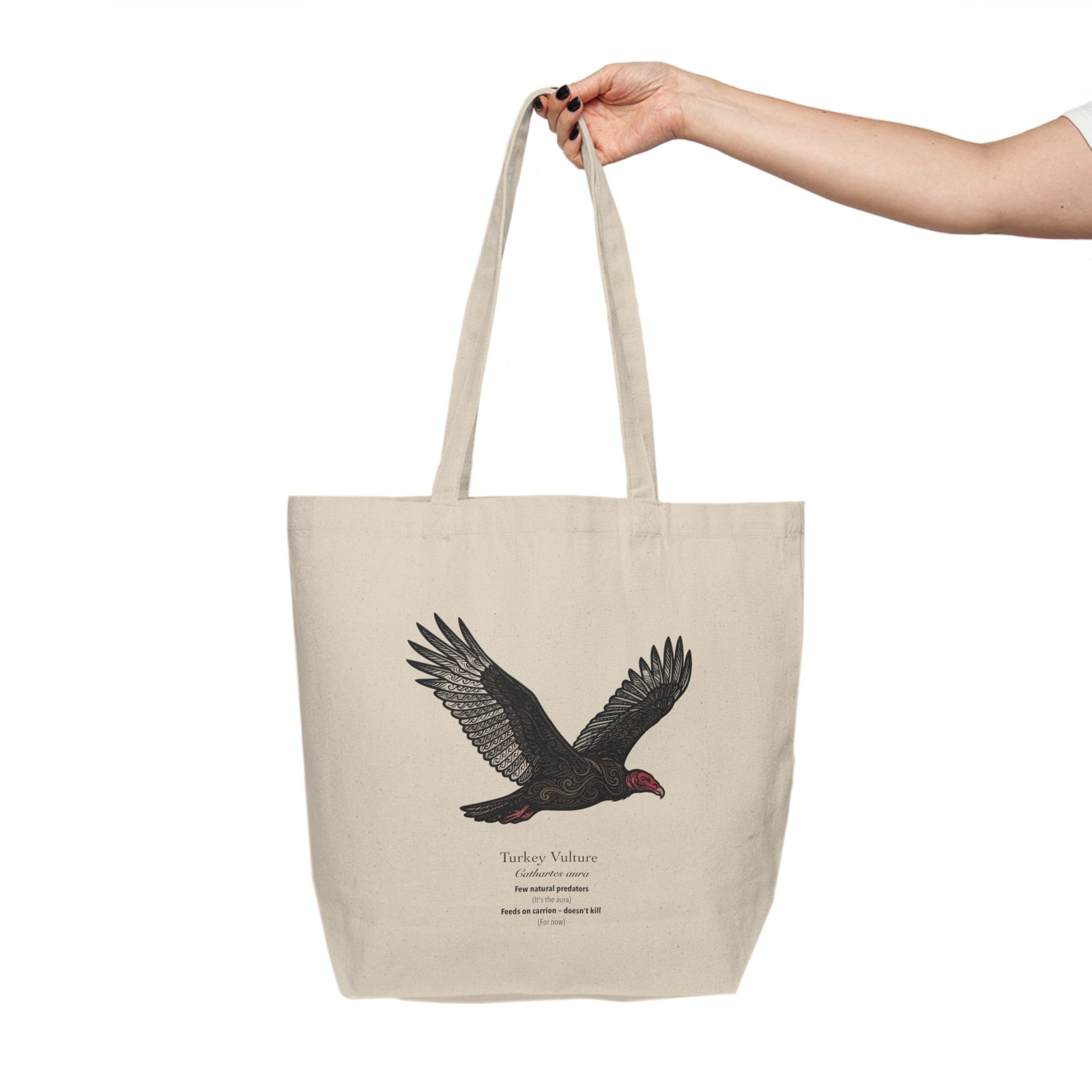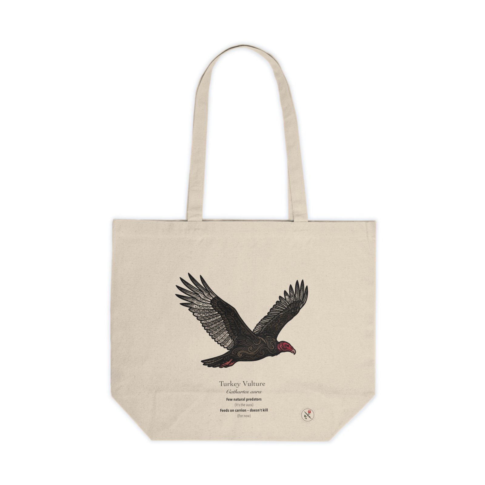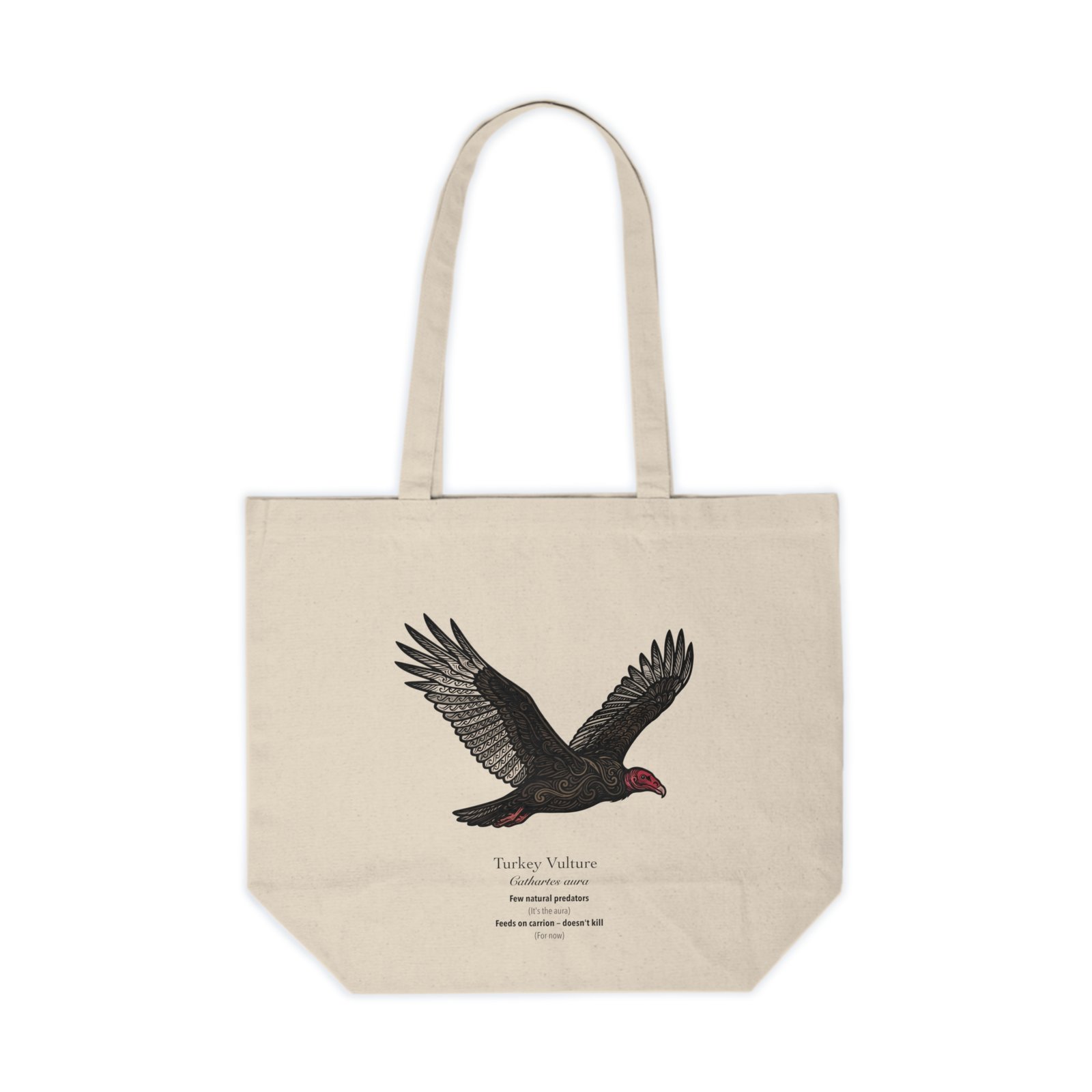 This sturdy cotton canvas tote features the Turkey Vulture (Cathartes aura) — broad-winged, red-faced, and gliding effortlessly on invisible thermals. Few natural predators. (It’s the aura.)